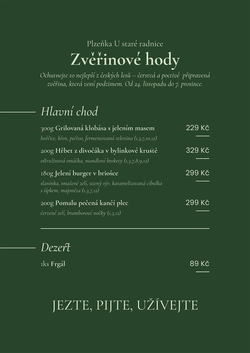 Gramáže surovin jsou uvedeny v syrovém stavu. Přílohy lze objednat pouze k hlavním jídlům. Seznam alergenů na vyžádání u obsluhy. Poloviční porce za 70% ceny. Doba přípravy jídla se pohybuje mezi 15-60 min. Pro děti (ve věku 0-18 let) vám obsluha ráda nabídne dětské menu.